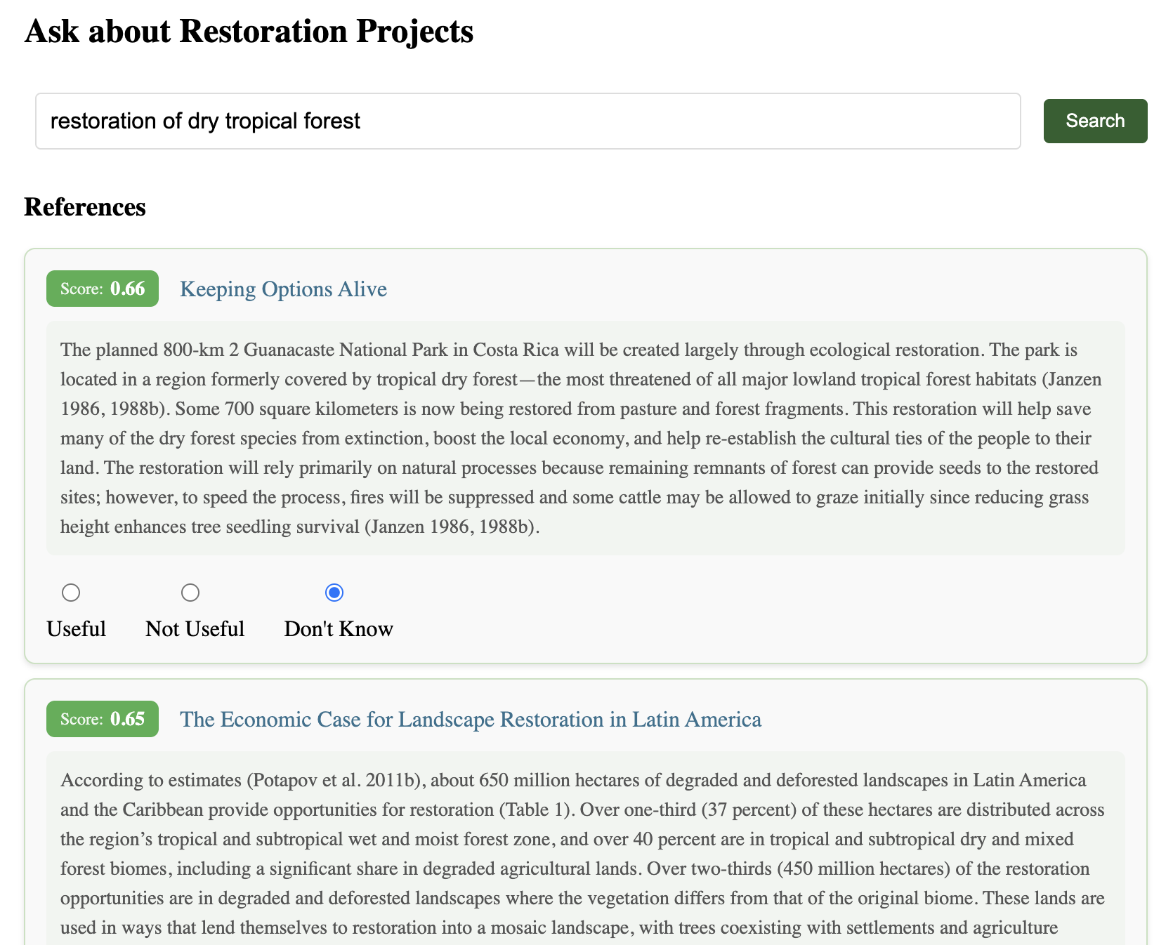 1. Catalog and organize reforestation knowledge in a transparent, structured, and user-friendly way, preserving links to original sources and context.Enable evidence-grounded search and Q&A, helping practitioners surface information relevant to specific geographies, ecosystems, and restoration interventions.