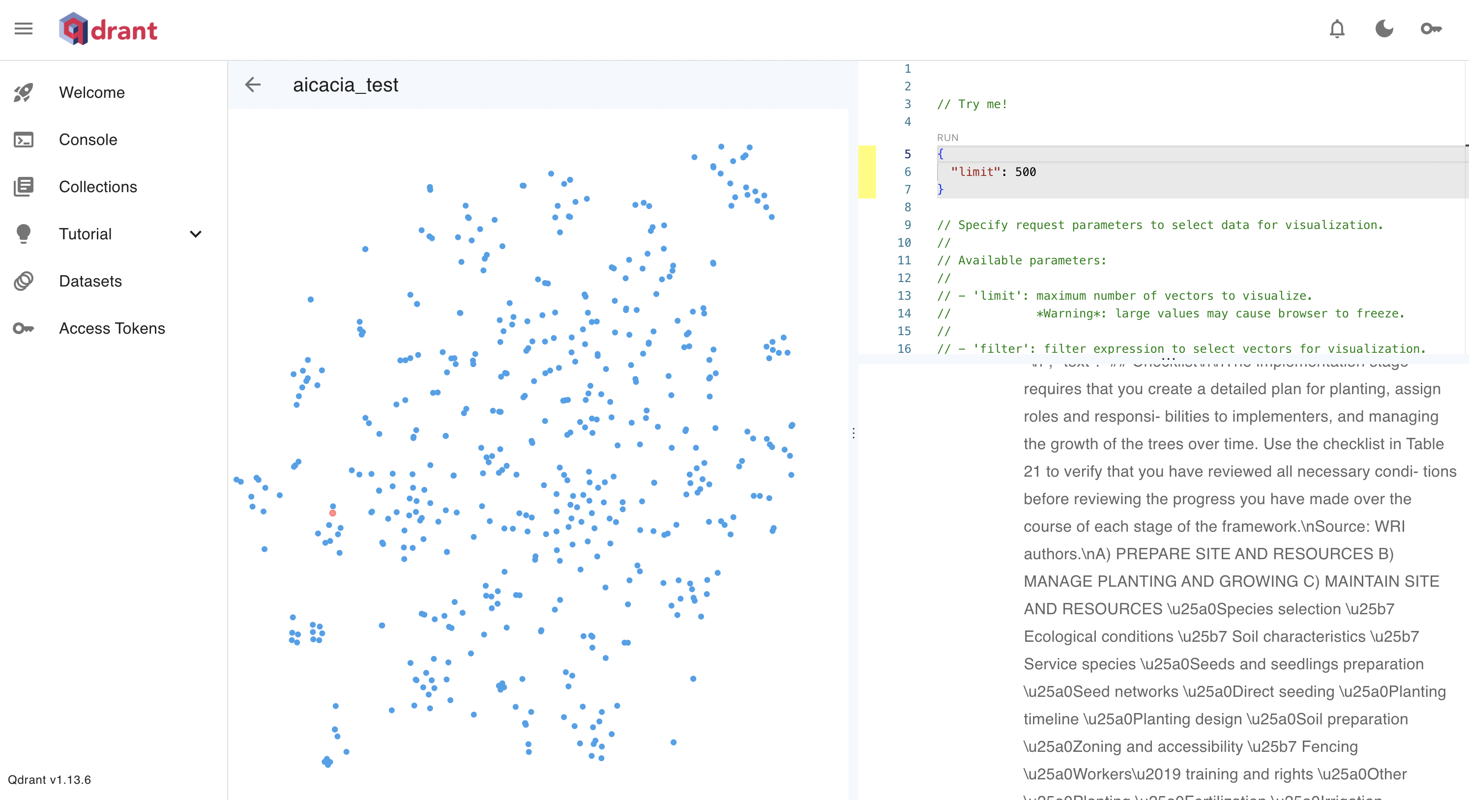 Visualization of an early iteration of the vector database (essentially a cloud of points representing the chunks of all the documents)